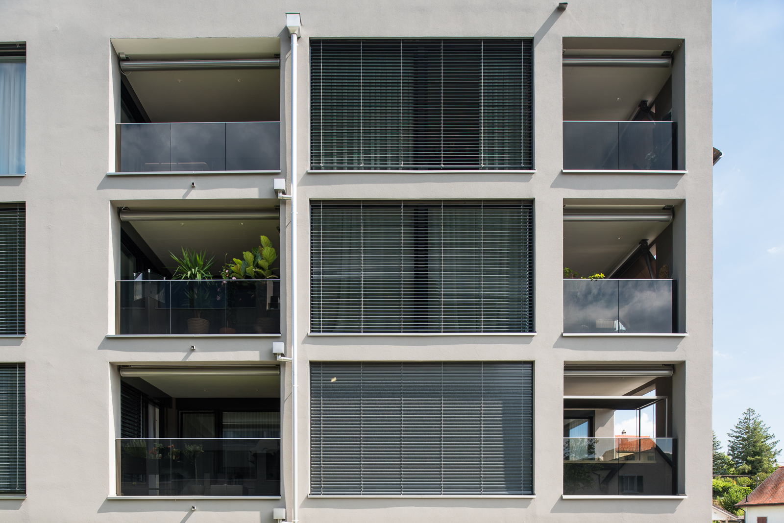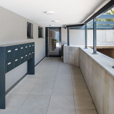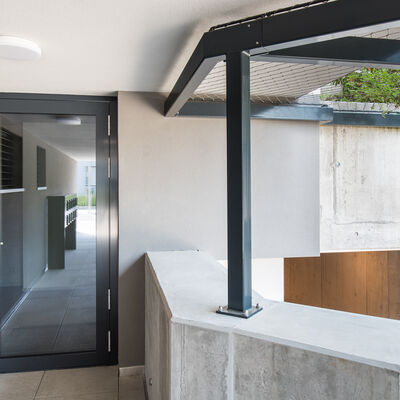 Somit durfte die Ankli Metallbau AG für die Häuser A-E jeweils Handläufe aus Chromnickelstahlrohr für das Treppenhaus, Staketengeländer, Ganzglasgeländer für die Terrassen und die Attikas sowie jeweils die Eingangspartien aus Türen und Briefkästenanlagen ausführen. Die Ganzglasgeländer, welche aus VSG Braunglas bestehen, wurden auf Verkleidungsbleche aus Chromnickelstahl montiert und sorgen für eine gewisse Transparenz der Sichtbarkeit. Ausserdem wurde bei allen Tiefgarageneinfahrten ein Unterstand aus Stahlrohr mit integriertem Geländer mit Webnetfüllung Typ Jakob realisiert. Alle Stahlteile wurden feuerverzinkt und in der entsprechenden Wunsch-RAL-Farbe pulverbeschichtet.