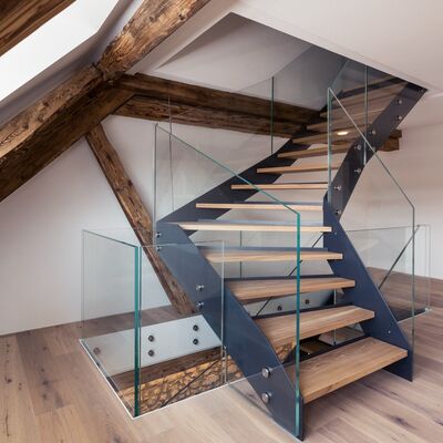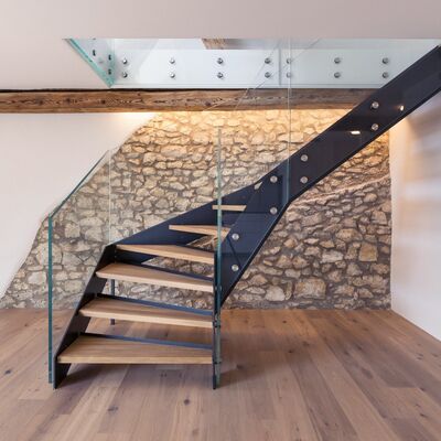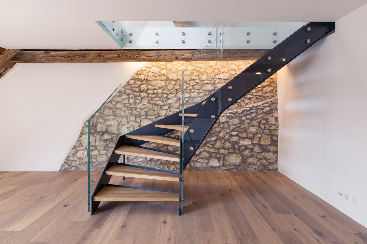 Eine der ältesten Liegenschaften der Stadt Laufen wurde im Jahre 2016 umgebaut und modernisiert. Der Bauherrschaft war es ein grosses Anliegen die bestehende alte Bausubstanz zu belassen. Neue Bauteile hingegen, sollen modern und schnittig daherkommen. Mit einer Kombination aus Metall, Glas und Holz setzten wir die Wünsche der Bauherrschaft gekonnt um. Die neue Treppenanlage ist aus Stahl gefertigt, welcher nachträglich in einer Eisenglimmerfarbe pulverbeschichtet wurde. Die seitlichen Geländer sind gänzlich aus Weissglas hergestellt worden und sorgen für maximale Transparenz. Eingesetzte Treppenstufen aus Eichenholz vereinen die Treppe zu einem perfekten Bauteil in Bezug auf Funktion und Ästhetik.