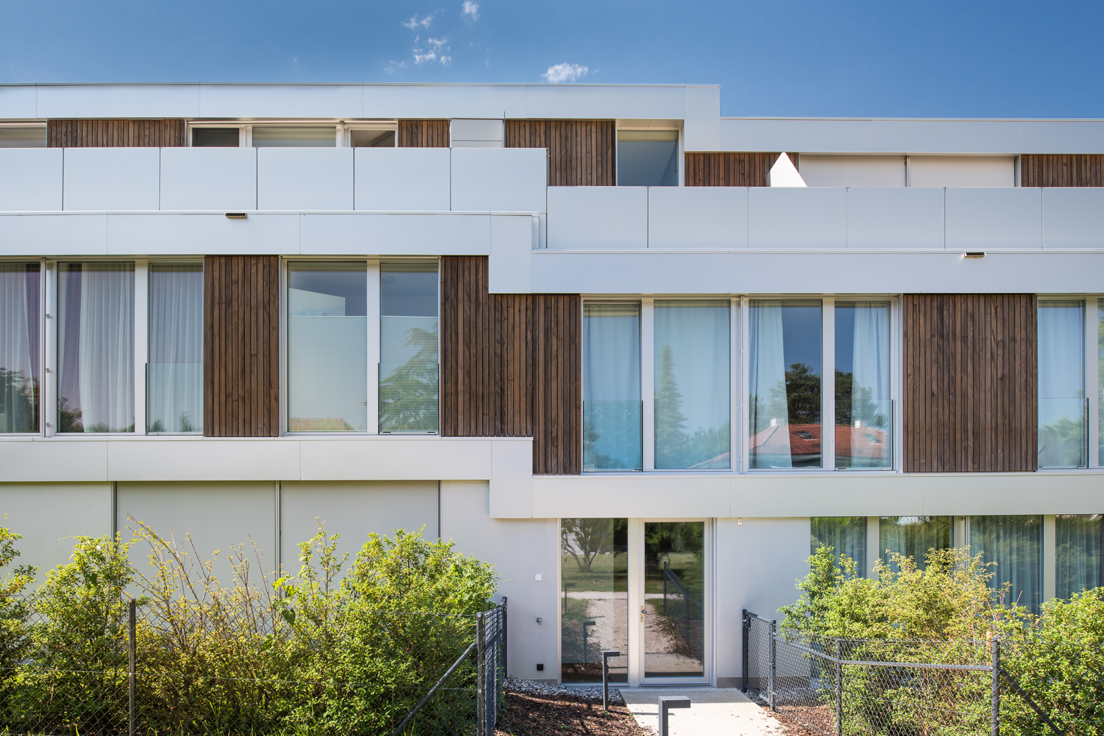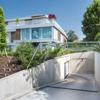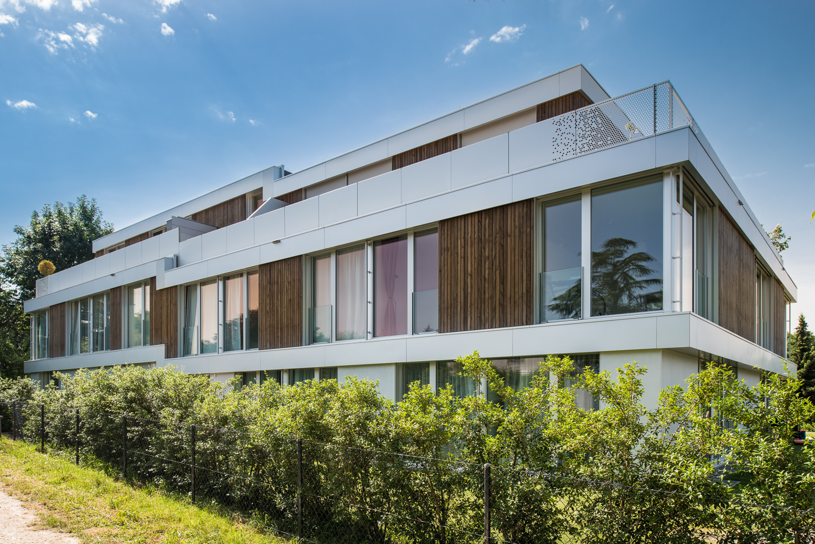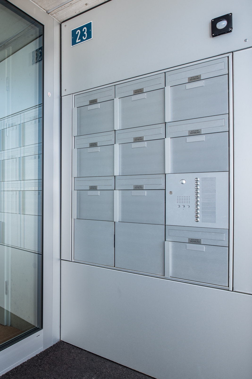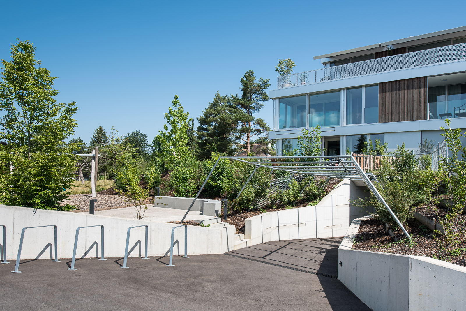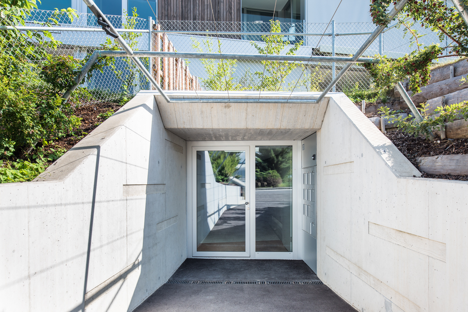 Es befindet sich in einer Wohnlage mit Blick ins Grüne. Somit erforderte es Metallbauarbeiten, welche sich perfekt in die Umgebung sowie dem modernen Baustil einfügen. Die Ankli Metallbau AG realisierte die Türe mit der Briefkastenanlage, die Blechverkleidung an der Aussenfassade, verschiedene Ausführungen der Geländer sowie ein Rankgerüst über der Einstellhalleneinfahrt und eines über dem Hauptzugang als Unterstand. Die Oberfläche der Türe, der Briefkastenanlage sowie des Geländers ist aus Aluminium realisiert und farblos eloxiert. Im Weiteren sind die Rankgerüste feuerverzinkt ohne eine Pulverbeschichtung. Durch diese naturellen Oberflächen der Metallbauarbeiten passen sie sich ideal in das Gesamtgefüge des Mehrfamilienhauses sowie in die natürliche Umgebung ein.