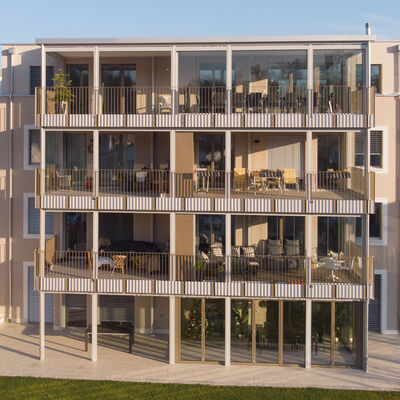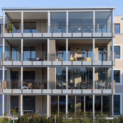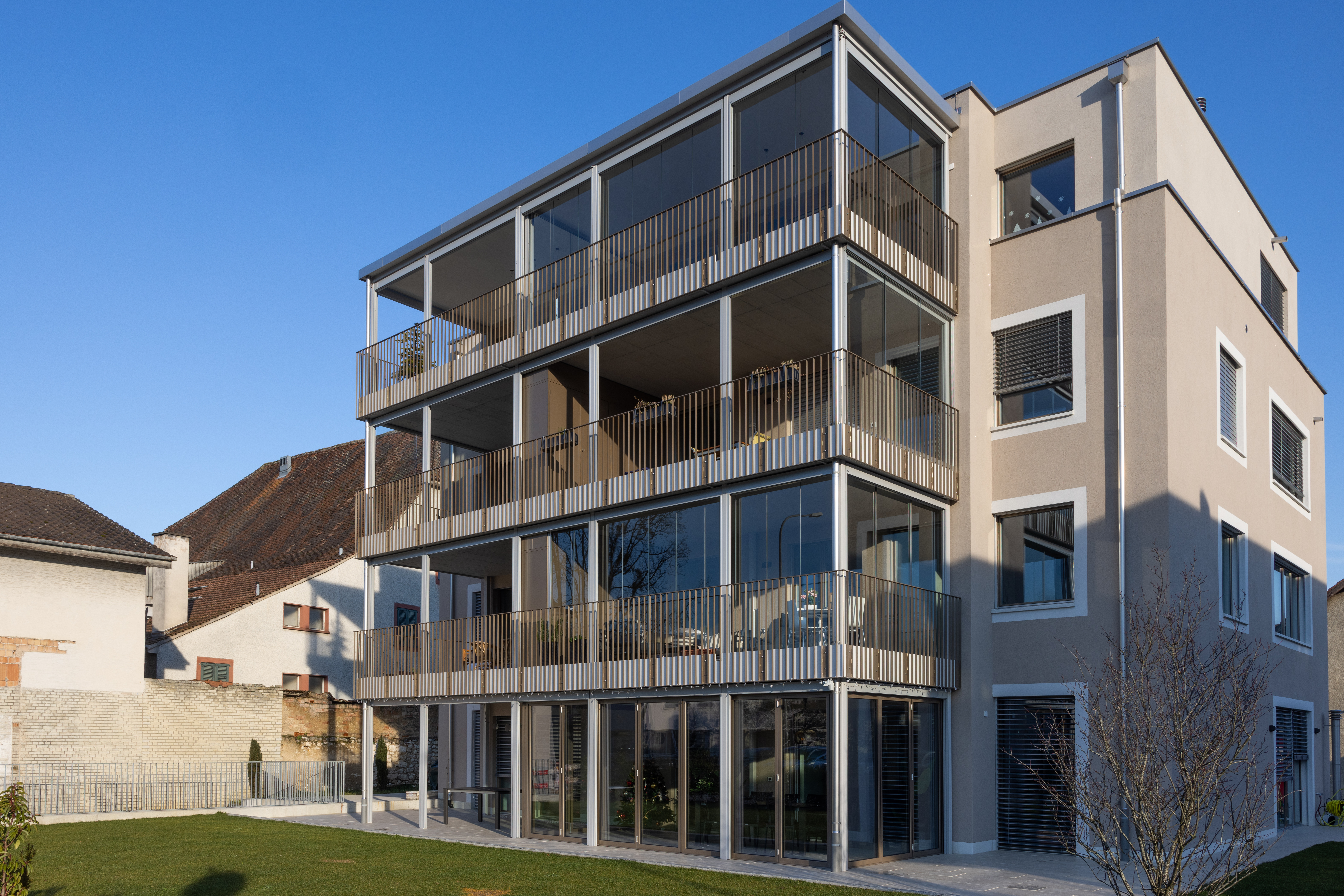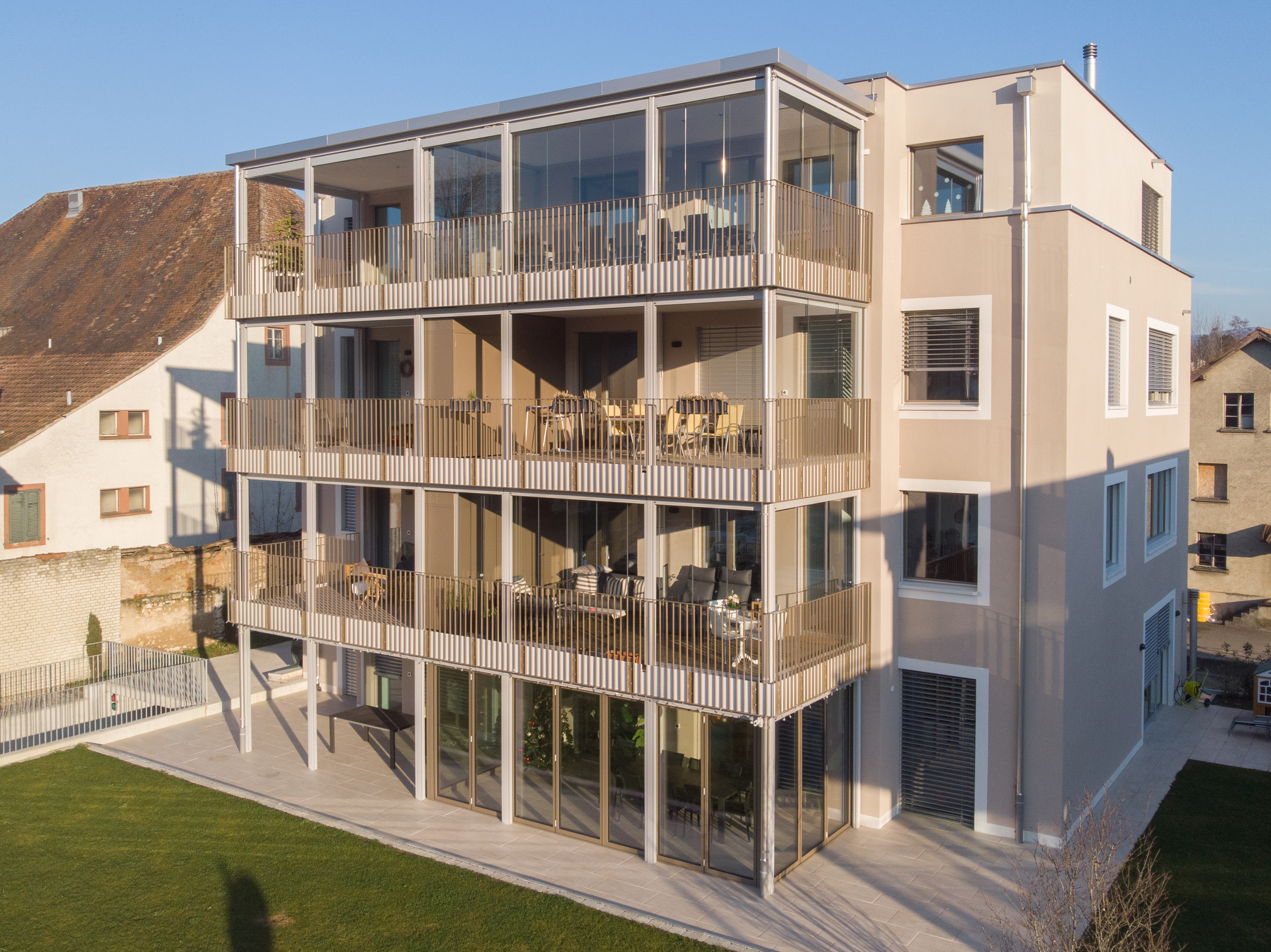 Die Eingangspartie und der Briefkasten wurden jeweils aus Aluminium in der gewünschten Farbe eloxiert. Im Weiteren sind die Balkongeländer aus Flachstahl feuerverzinkt und pulverbeschichtet stirnseitig an den Beton montiert. Zu guter Letzt wurden Wintergärten bei einzelnen Parteien / Eigentumswohnungen realisiert. Diese Verglasungen bieten einen idealen Schutz vor Witterungen und einen transparenten Durchblick, um trotzdem bei jedem Wetter auf den Balkon die Zeit und den Ausblick zu geniessen.