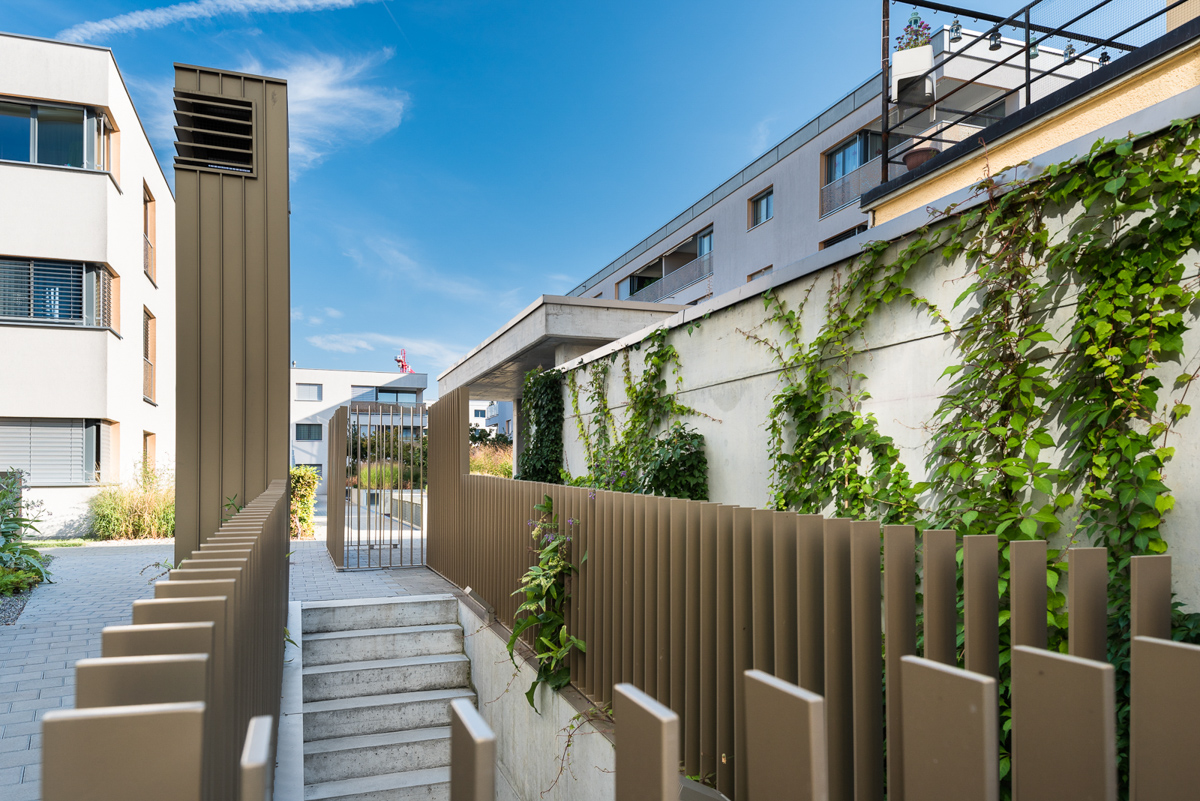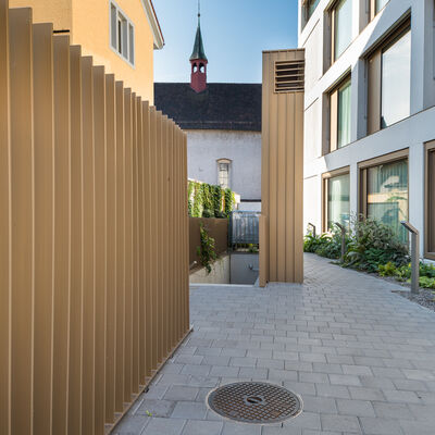 Selbst die Entlüftung der Tiefgarage welche normalerweise über ein langweiliges Stahlrohr erfolgt, wurde mit einem formschönen Kamin aus Stahl und mehrfach abgekantetem Aluminiumblech gefertigt. Die Konturen des Kamins harmonieren perfekt mit den restlichen Bauteilen. Die Briefkastenanlage sowie die Blechverkleidungen der Bankomaten runden das angestrebte Konzept in Bezug auf Farbe und Ästhetik als Ganzes ab.