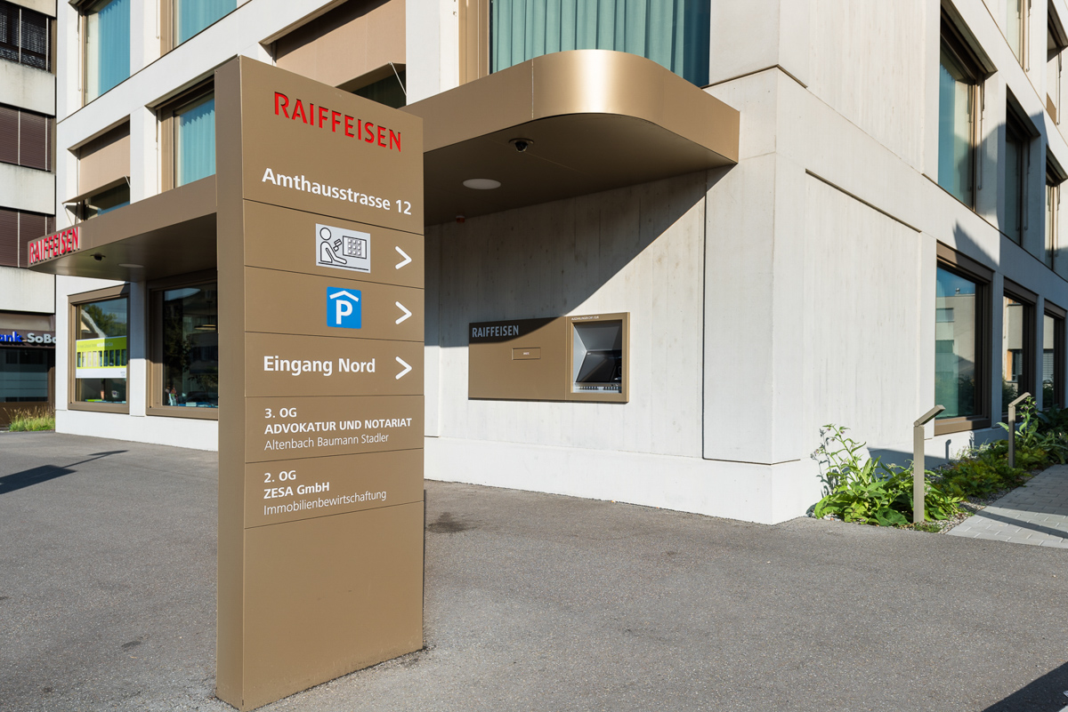 Die Schweizer Banken haben den Anspruch, gegenüber Ihren Kunden, absolut professionell, vertrauenswürdig und mit einem perfekten Erscheinungsbild zu punkten. Dieses Bestreben wurde ersichtlich als in Dornach eine neue Filiale der Raiffeisenbank gebaut wurde. Zusammen mit dem zuständigen Architekten durften wir die anspruchsvollen Metallbauarbeiten planen und produzieren. Das markante Vordach beim Haupteingang wurde vollumfänglich mit Aluminiumblech verkleidet. Es sollten keine Befestigungsmittel zu sehen sein. Die abgerundeten Ecken integrieren sich elegant in die sonst geradlinigen Konturen des Gebäudes. Die Aussengeländer erscheinen elegant und dennoch bieten Sie den nötigen Halt der wichtig für das Vertrauen in die Konstruktion ist.