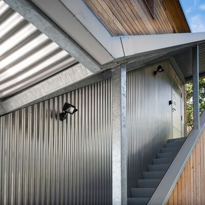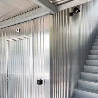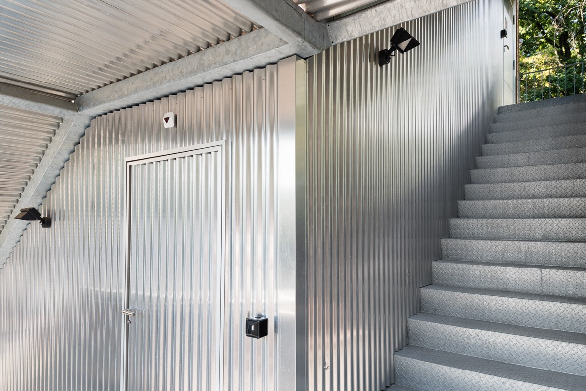Zusammen mit dem zuständigen Architekturbüro konnten wir dieses gigantische Bauteil formschön und modern gestalten. Die seitliche Verkleidung mit Aluminium-Wellblech verleiht der Treppe einen unverkennbaren Charakter.