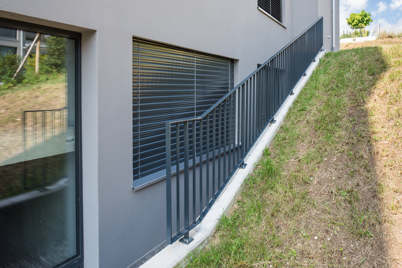 Somit durfte die Ankli Metallbau AG für die Häuser A-E jeweils Handläufe aus Chromnickelstahlrohr für das Treppenhaus, Staketengeländer, Ganzglasgeländer für die Terrassen und die Attikas sowie jeweils die Eingangspartien aus Türen und Briefkästenanlagen ausführen. Die Ganzglasgeländer, welche aus VSG Braunglas bestehen, wurden auf Verkleidungsbleche aus Chromnickelstahl montiert und sorgen für eine gewisse Transparenz der Sichtbarkeit. Ausserdem wurde bei allen Tiefgarageneinfahrten ein Unterstand aus Stahlrohr mit integriertem Geländer mit Webnetfüllung Typ Jakob realisiert. Alle Stahlteile wurden feuerverzinkt und in der entsprechenden Wunsch-RAL-Farbe pulverbeschichtet.