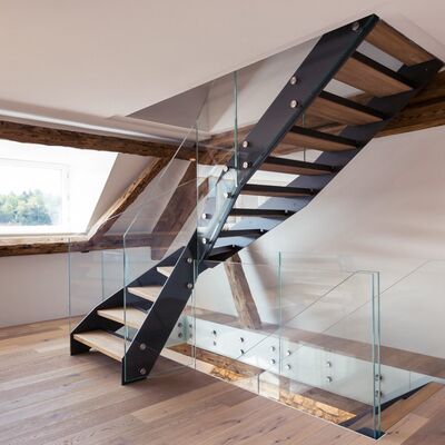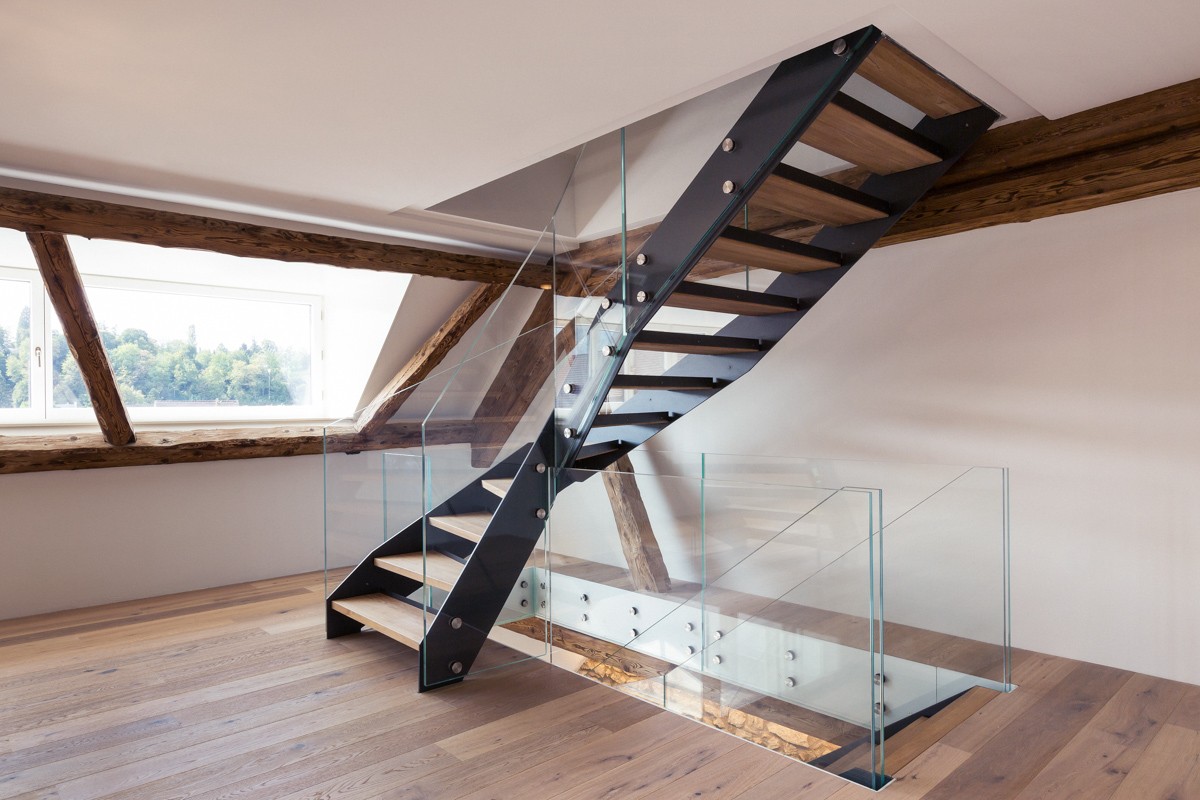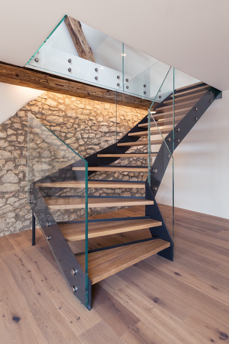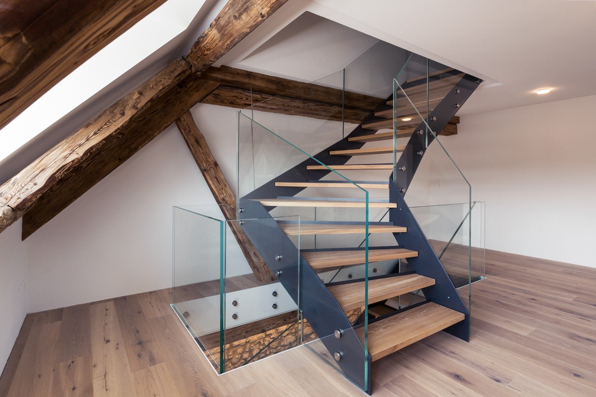 Eine der ältesten Liegenschaften der Stadt Laufen wurde im Jahre 2016 umgebaut und modernisiert. Der Bauherrschaft war es ein grosses Anliegen die bestehende alte Bausubstanz zu belassen. Neue Bauteile hingegen, sollen modern und schnittig daherkommen. Mit einer Kombination aus Metall, Glas und Holz setzten wir die Wünsche der Bauherrschaft gekonnt um. Die neue Treppenanlage ist aus Stahl gefertigt, welcher nachträglich in einer Eisenglimmerfarbe pulverbeschichtet wurde. Die seitlichen Geländer sind gänzlich aus Weissglas hergestellt worden und sorgen für maximale Transparenz. Eingesetzte Treppenstufen aus Eichenholz vereinen die Treppe zu einem perfekten Bauteil in Bezug auf Funktion und Ästhetik.