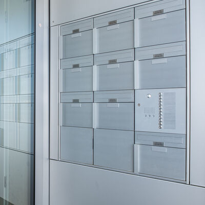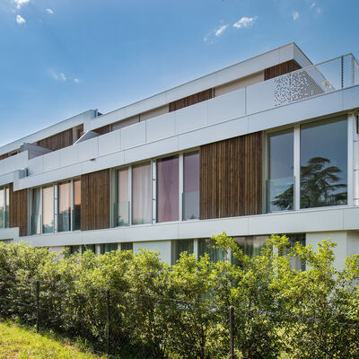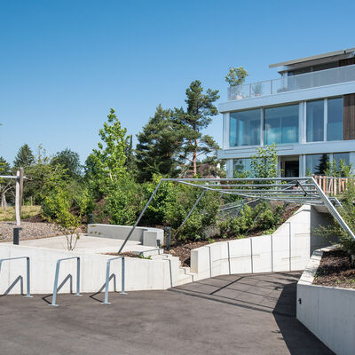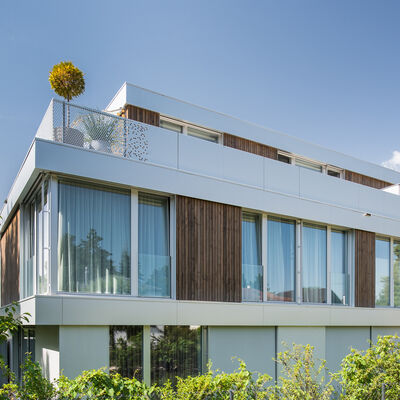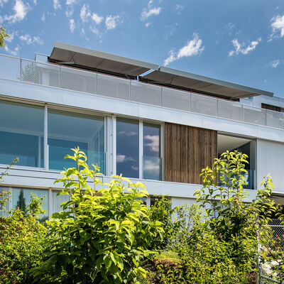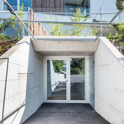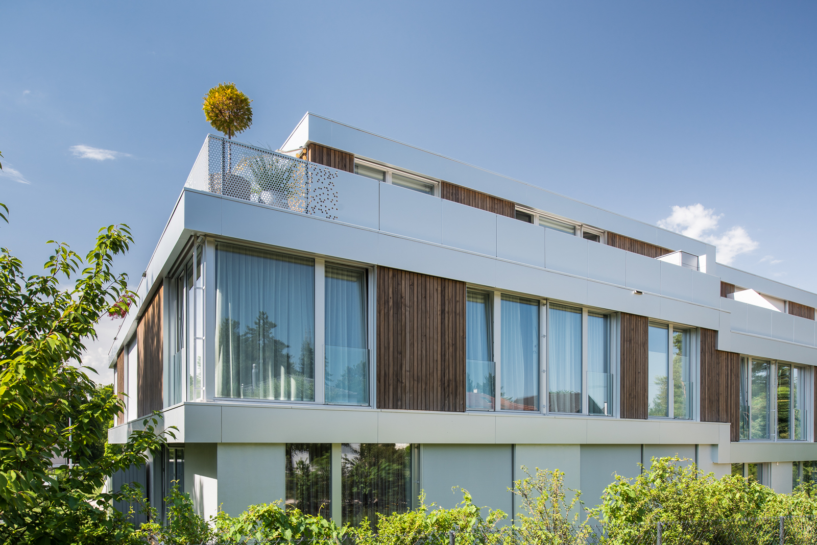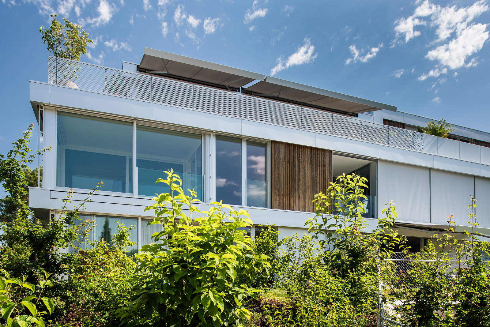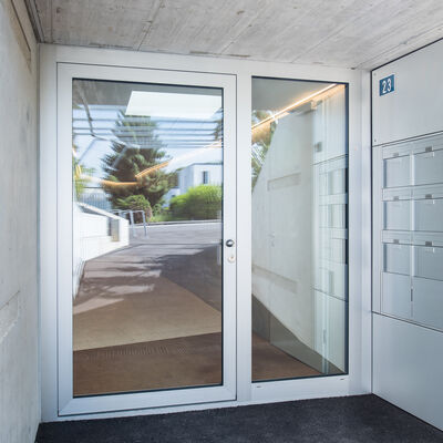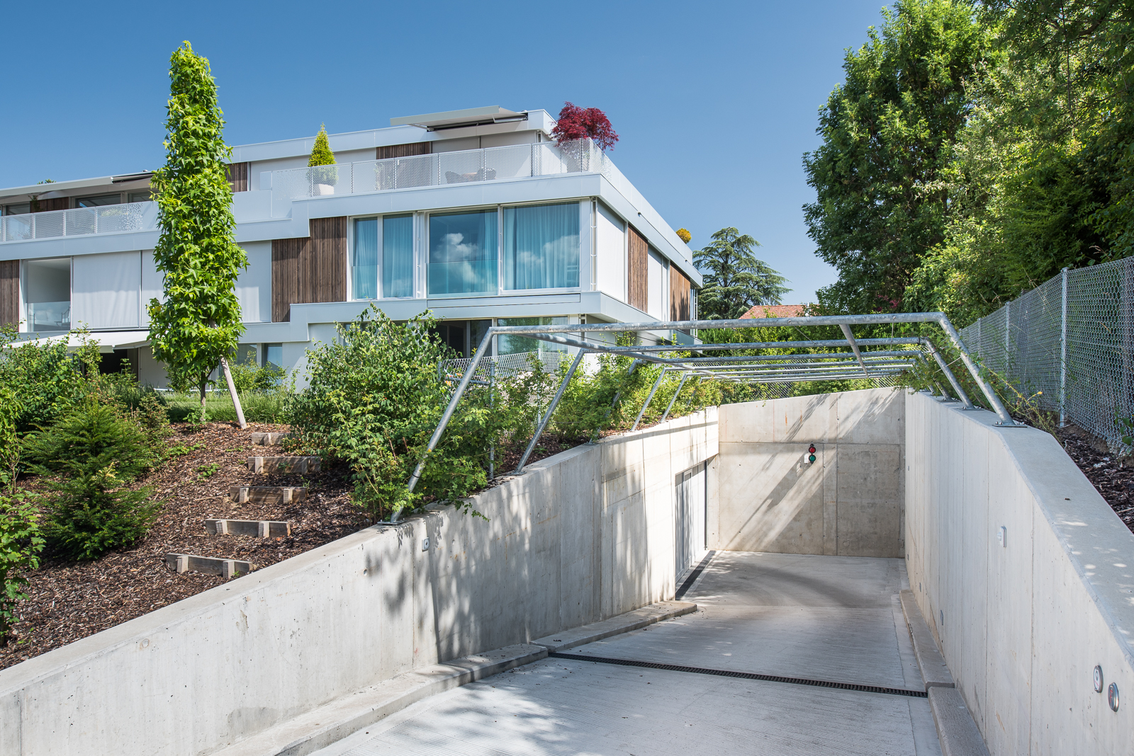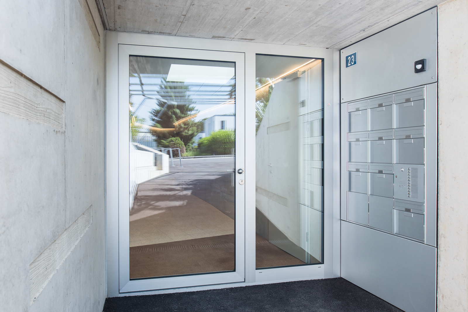 Es befindet sich in einer Wohnlage mit Blick ins Grüne. Somit erforderte es Metallbauarbeiten, welche sich perfekt in die Umgebung sowie dem modernen Baustil einfügen. Die Ankli Metallbau AG realisierte die Türe mit der Briefkastenanlage, die Blechverkleidung an der Aussenfassade, verschiedene Ausführungen der Geländer sowie ein Rankgerüst über der Einstellhalleneinfahrt und eines über dem Hauptzugang als Unterstand. Die Oberfläche der Türe, der Briefkastenanlage sowie des Geländers ist aus Aluminium realisiert und farblos eloxiert. Im Weiteren sind die Rankgerüste feuerverzinkt ohne eine Pulverbeschichtung. Durch diese naturellen Oberflächen der Metallbauarbeiten passen sie sich ideal in das Gesamtgefüge des Mehrfamilienhauses sowie in die natürliche Umgebung ein.