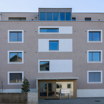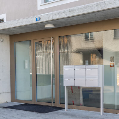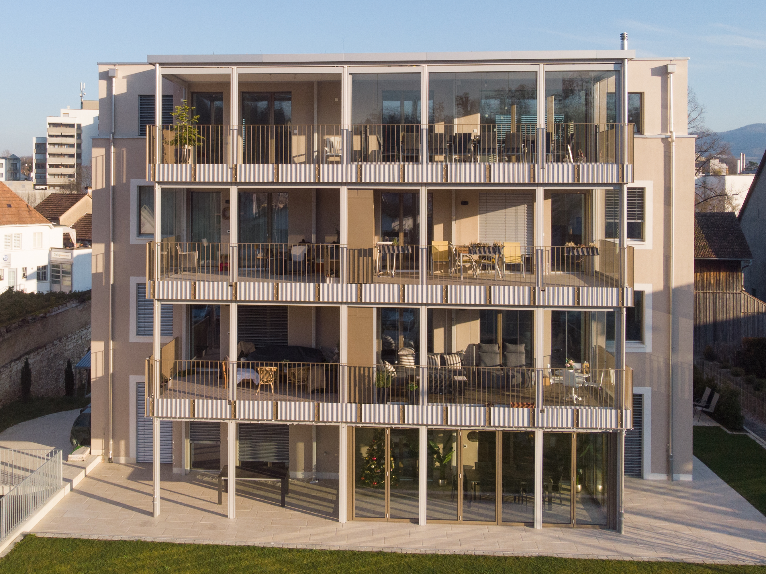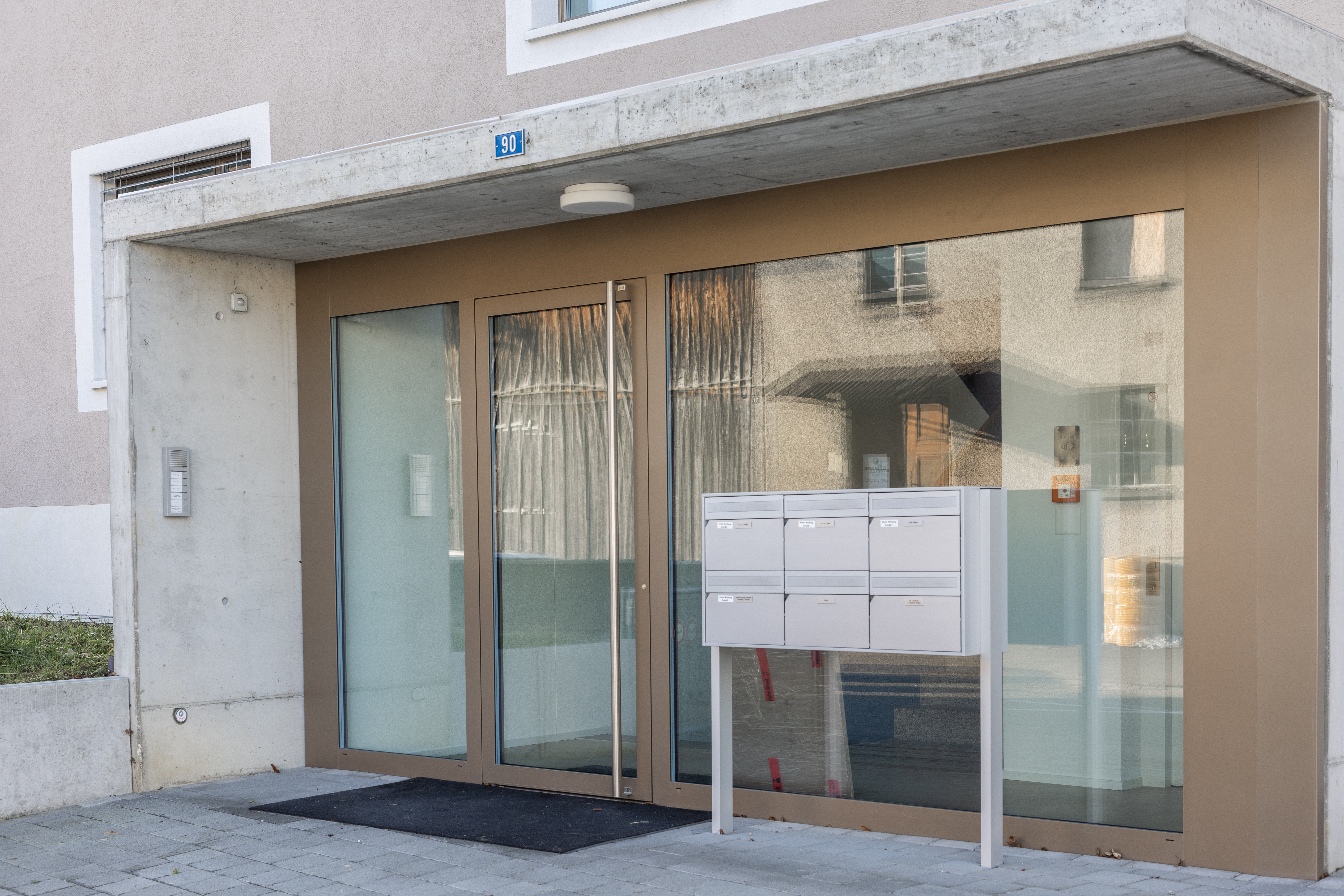 Die Eingangspartie und der Briefkasten wurden jeweils aus Aluminium in der gewünschten Farbe eloxiert. Im Weiteren sind die Balkongeländer aus Flachstahl feuerverzinkt und pulverbeschichtet stirnseitig an den Beton montiert. Zu guter Letzt wurden Wintergärten bei einzelnen Parteien / Eigentumswohnungen realisiert. Diese Verglasungen bieten einen idealen Schutz vor Witterungen und einen transparenten Durchblick, um trotzdem bei jedem Wetter auf den Balkon die Zeit und den Ausblick zu geniessen.