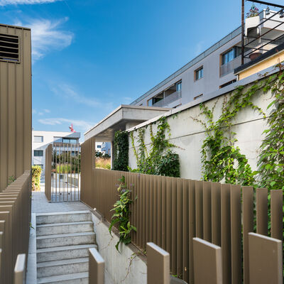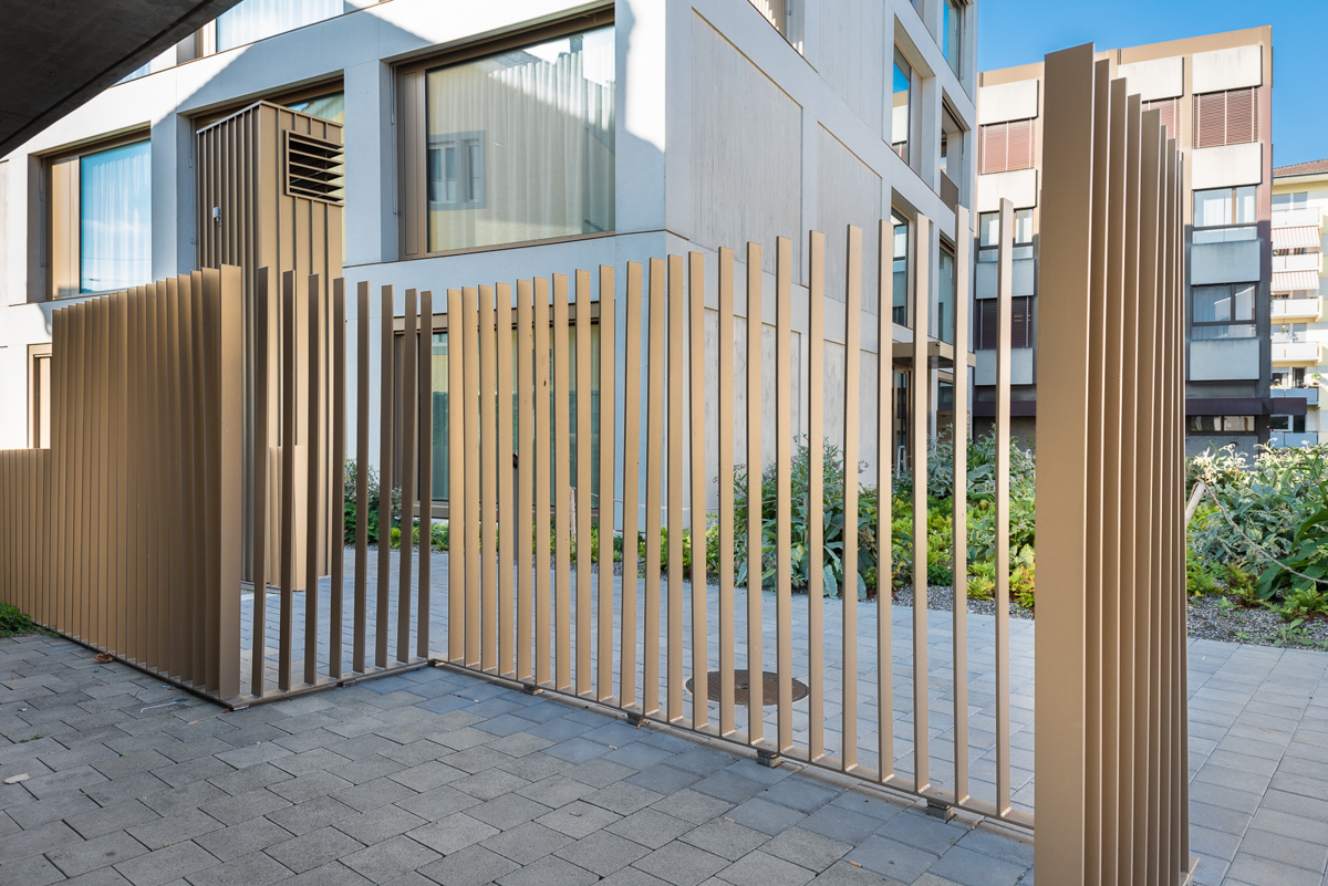Selbst die Entlüftung der Tiefgarage welche normalerweise über ein langweiliges Stahlrohr erfolgt, wurde mit einem formschönen Kamin aus Stahl und mehrfach abgekantetem Aluminiumblech gefertigt. Die Konturen des Kamins harmonieren perfekt mit den restlichen Bauteilen. Die Briefkastenanlage sowie die Blechverkleidungen der Bankomaten runden das angestrebte Konzept in Bezug auf Farbe und Ästhetik als Ganzes ab.