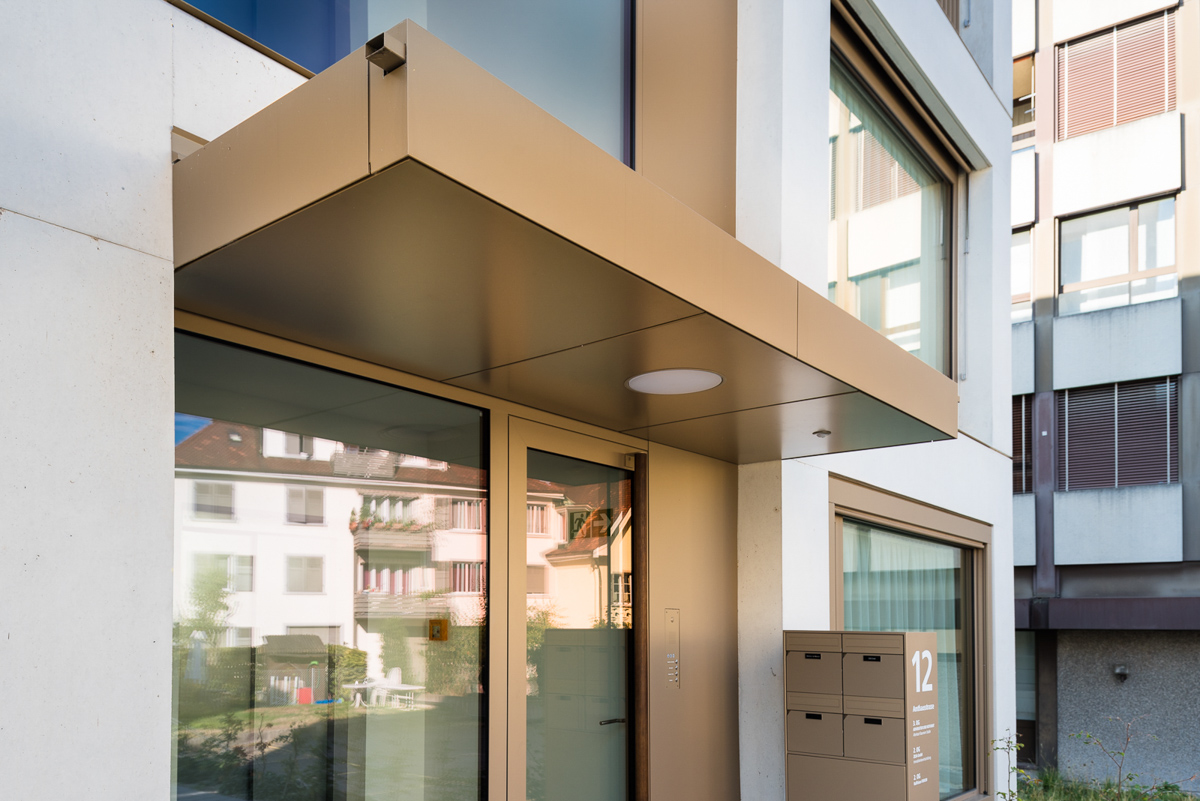 Die Schweizer Banken haben den Anspruch, gegenüber Ihren Kunden, absolut professionell, vertrauenswürdig und mit einem perfekten Erscheinungsbild zu punkten. Dieses Bestreben wurde ersichtlich als in Dornach eine neue Filiale der Raiffeisenbank gebaut wurde. Zusammen mit dem zuständigen Architekten durften wir die anspruchsvollen Metallbauarbeiten planen und produzieren. Das markante Vordach beim Haupteingang wurde vollumfänglich mit Aluminiumblech verkleidet. Es sollten keine Befestigungsmittel zu sehen sein. Die abgerundeten Ecken integrieren sich elegant in die sonst geradlinigen Konturen des Gebäudes. Die Aussengeländer erscheinen elegant und dennoch bieten Sie den nötigen Halt der wichtig für das Vertrauen in die Konstruktion ist.