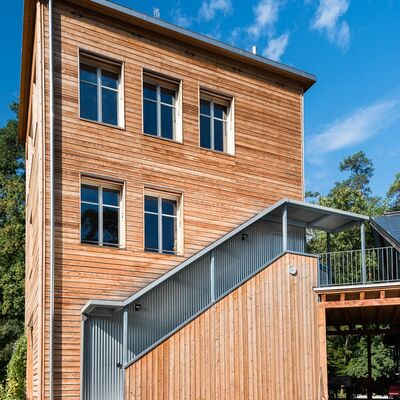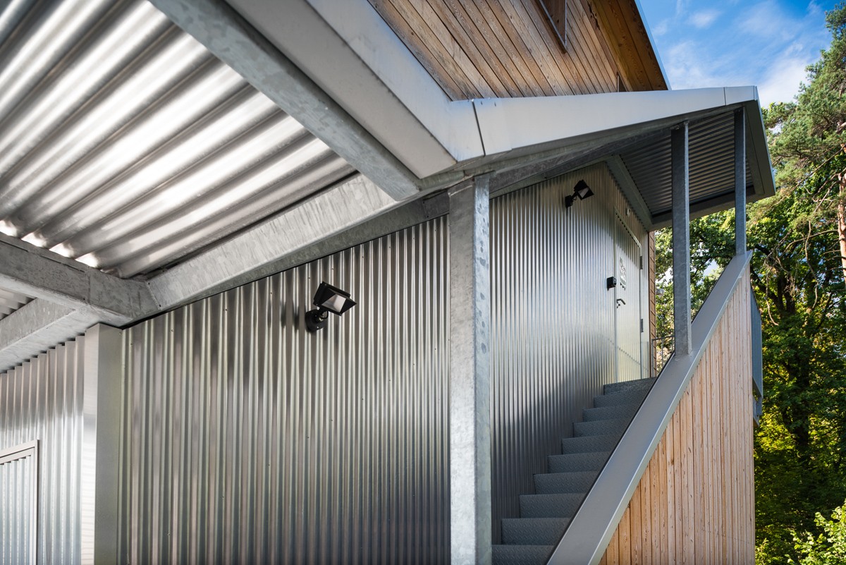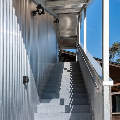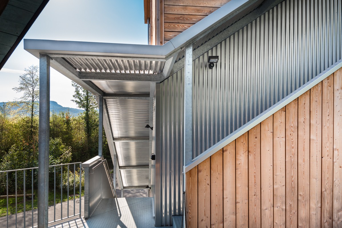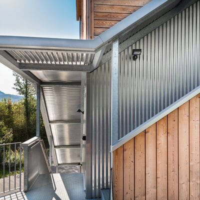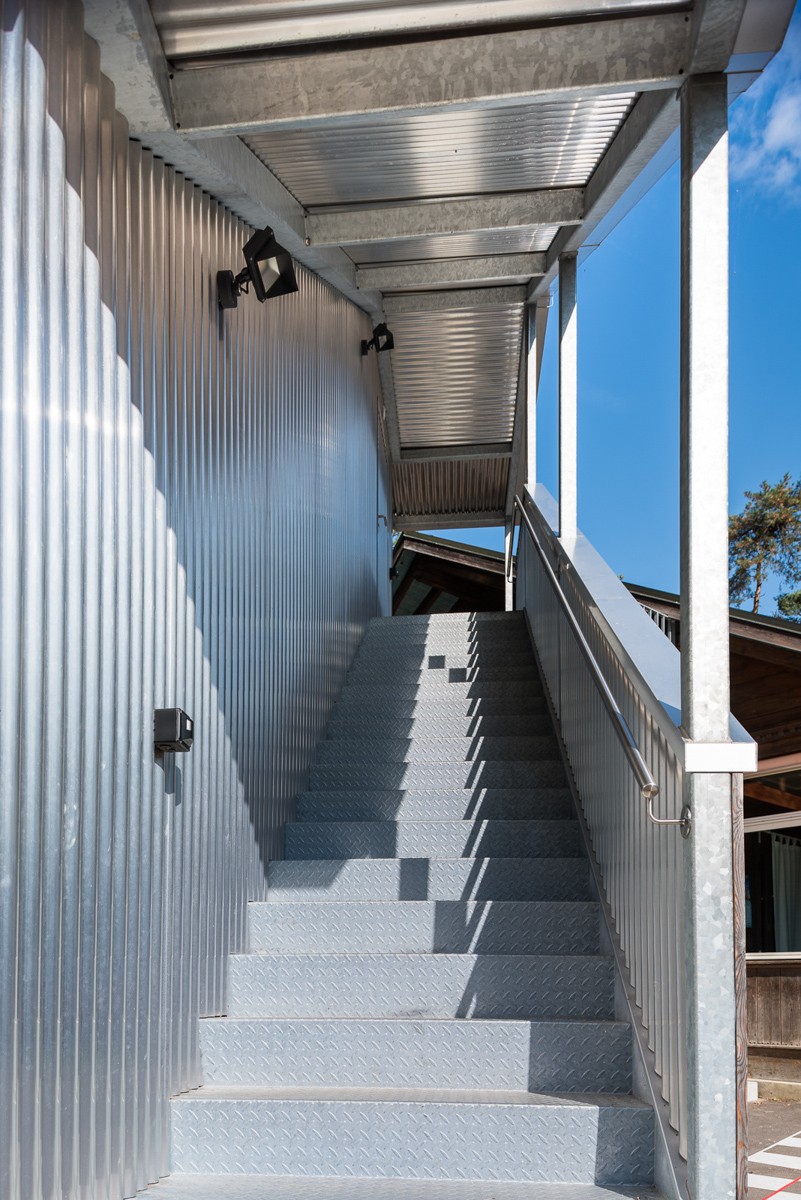 Zusammen mit dem zuständigen Architekturbüro konnten wir dieses gigantische Bauteil formschön und modern gestalten. Die seitliche Verkleidung mit Aluminium-Wellblech verleiht der Treppe einen unverkennbaren Charakter.