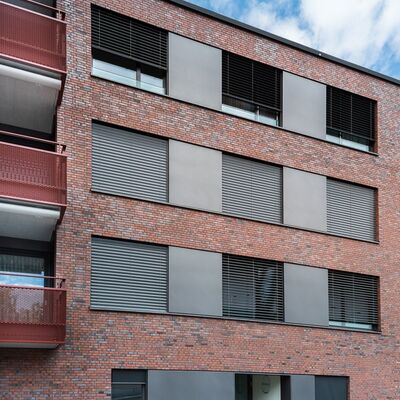 Die Metallverkleidungen zwischen den Fenstern, wurden mit einem thermisch getrennten Fassadensystem montiert. Richtig eingesetzt können die Fassadenbleche ästhetisch schöne Akzente setzen.